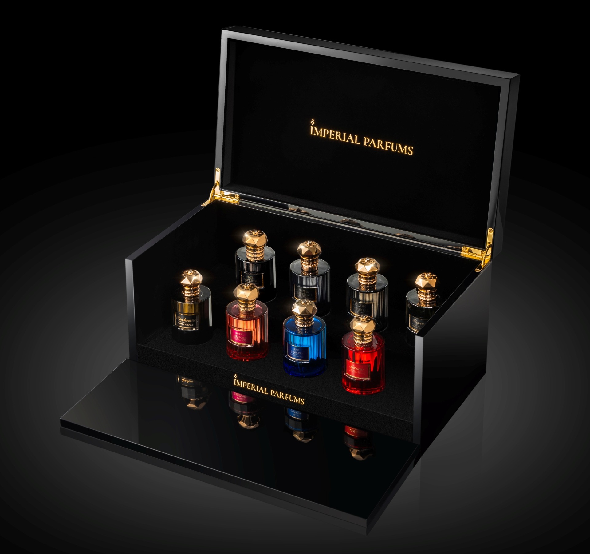 Imperial Parfums presenta su exclusiva colección en un suntuoso estuche elaborado en madera de caoba lacada en negro y forrado con tejido Alcantara.